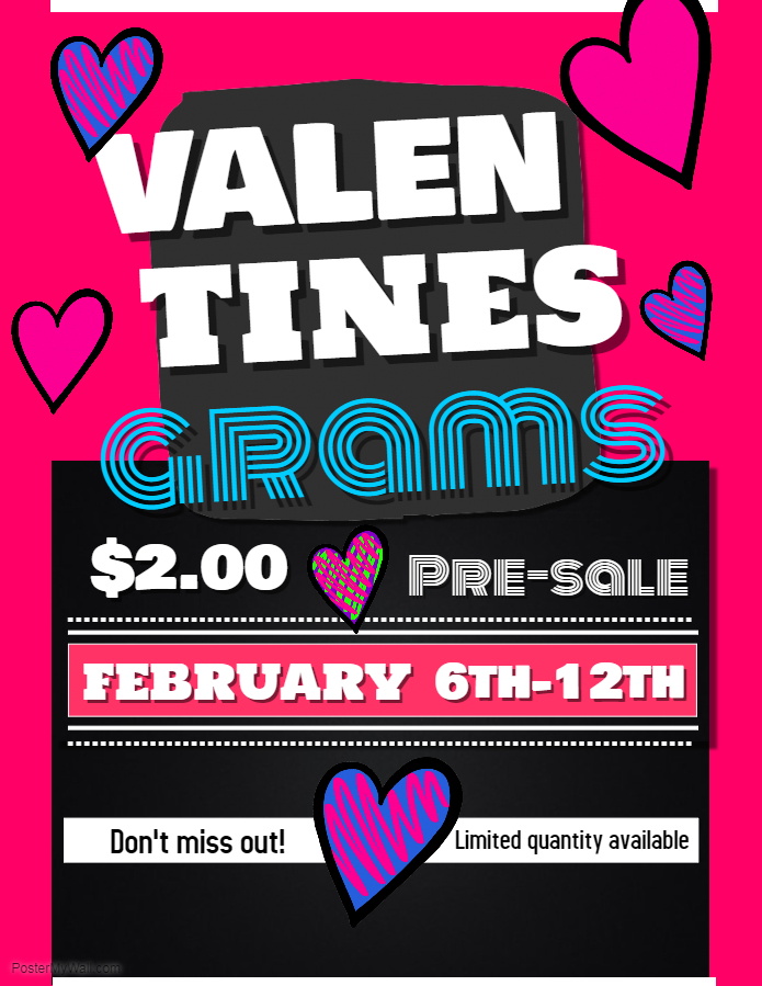 Tuesday, February 6 through Monday, February 12 Valentine Grams and School Dance Tickets go on sale before and after school.