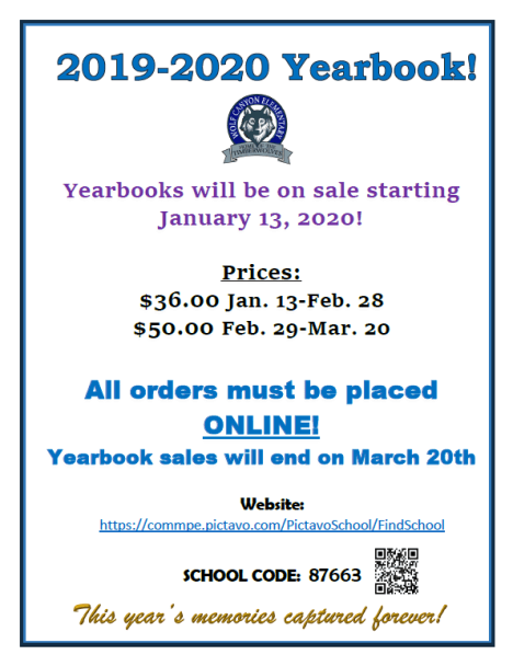 Yearbooks go on sale January 13th! Pre-sales will run until Feb. 28 . Our pre-sale price is $36.00 and will increase to $50.00 after that. All sales will end March 20 and must be completed online. To order, please visit https://commpe.pictavo.com/PictavoSchool/FindSchool and use school code 87663.