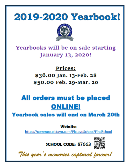 Yearbooks are on sale now! The pre-sale price is $36.00 and will run until February 28th. The price will increase to $50.00 after that so get yours early! All sales will end March 20 and must be completed online. To order, please visit: https://commpe.pictavo.com/PictavoSchool/FindSchool and use school code 87663.