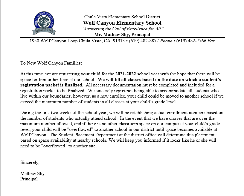 Please note that Wolf Canyon is an impacted school and there is a possibility that we may not have space to accommodate all students. Please review the memo below for more information.