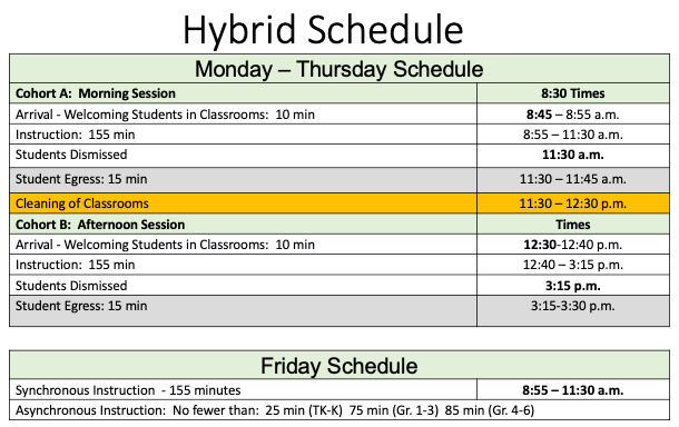 During parent teacher conferences, teachers will be confirming parent preference as to whether they wish for their child to attend hybrid learning or continue with distance learning when we return on April 12th. The Monday-Thursday and Friday hybrid schedule is below.