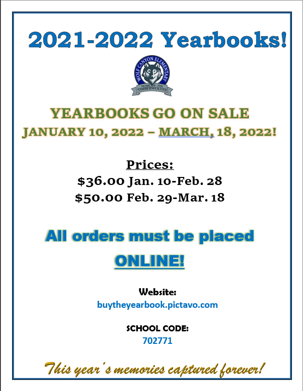 Our 21/22 Yearbooks will go on sale starting January 10th for $36 until Feb. 28. The price will increase to $50 after that date. All sales end on March 18th and must be placed online.