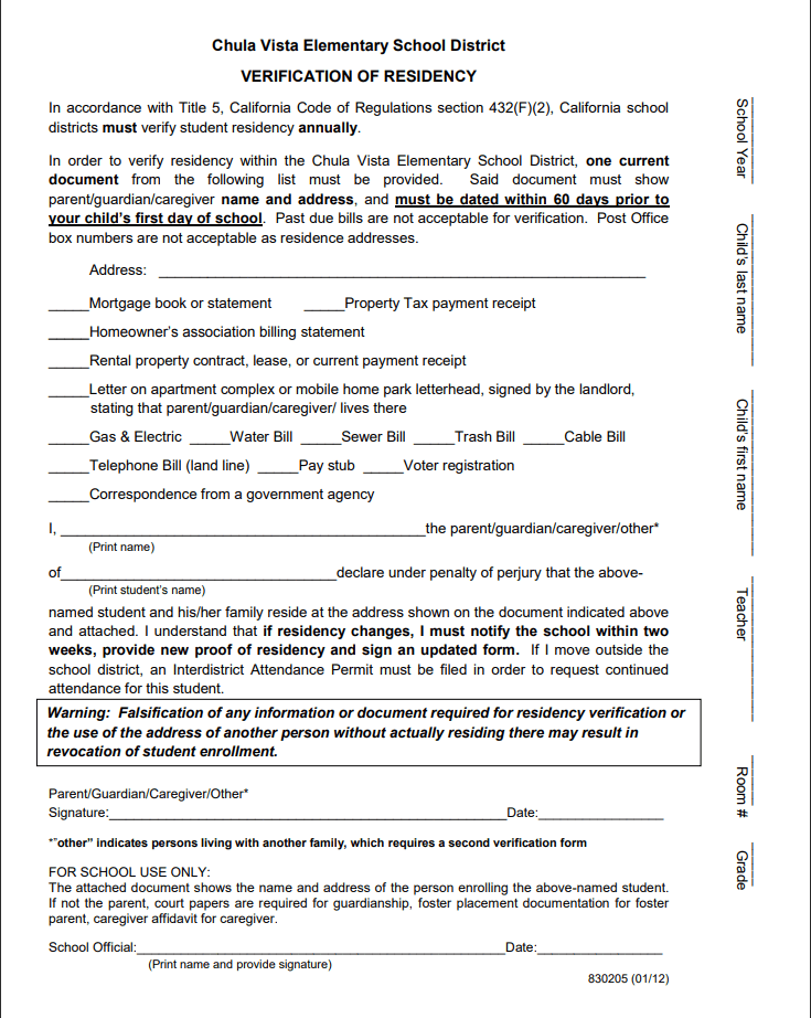 Residency verification will take place online. All students returning to any school in the Chula Vista Elementary School District for the 2022/23 school year are required to prove residency with their school of attendance before the start of school in order for their child’s name to be placed on a class list.