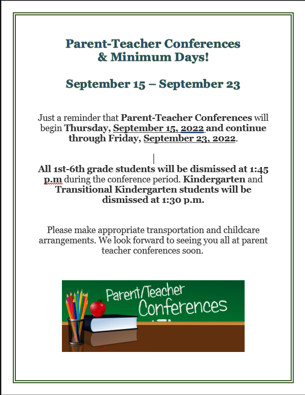 Just a reminder that Parent-Teacher Conferences begin today, Thursday, September 15 and continue through Friday, September 23rd.