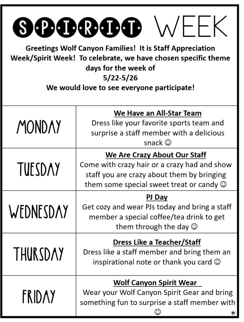While nationally, staff appreciation week is celebrated next week, we have decided to celebrate the week of 5/22-5/26 (because Local Measures and State Testing will finally be done). Families can obviously still celebrate the teachers and staff during the traditional appreciation week, but we feel the spirit week taking place after testing won’t interfere with the nature of testing!