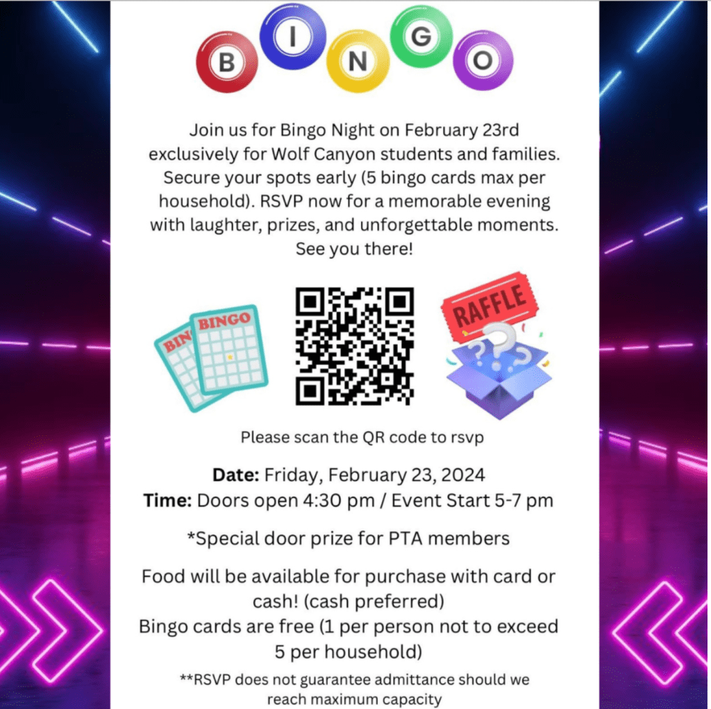 Wolf Canyon PTA’s Bingo Night is coming up on Friday, 2/23 with amazing prizes, special guests, food, and fun with your fellow Timberwolves!