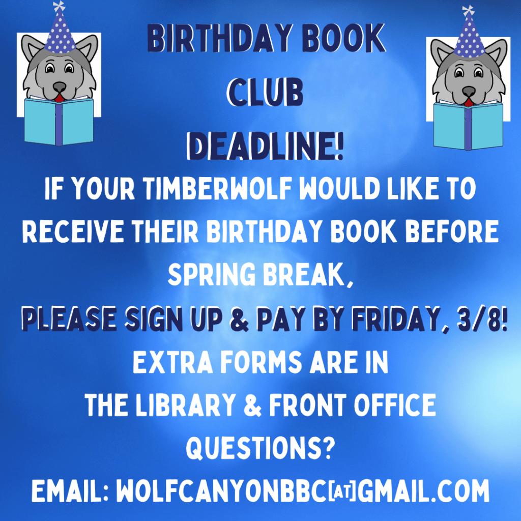 Our next Birthday Book Club celebration will be at the end of this quarter. Please turn in all forms & payment no later than Friday, 3/8 to be included on the list and receive your book. Extra forms can be found in the library or front office. Any questions, please email: wolfcanyonbbc@gmail.com