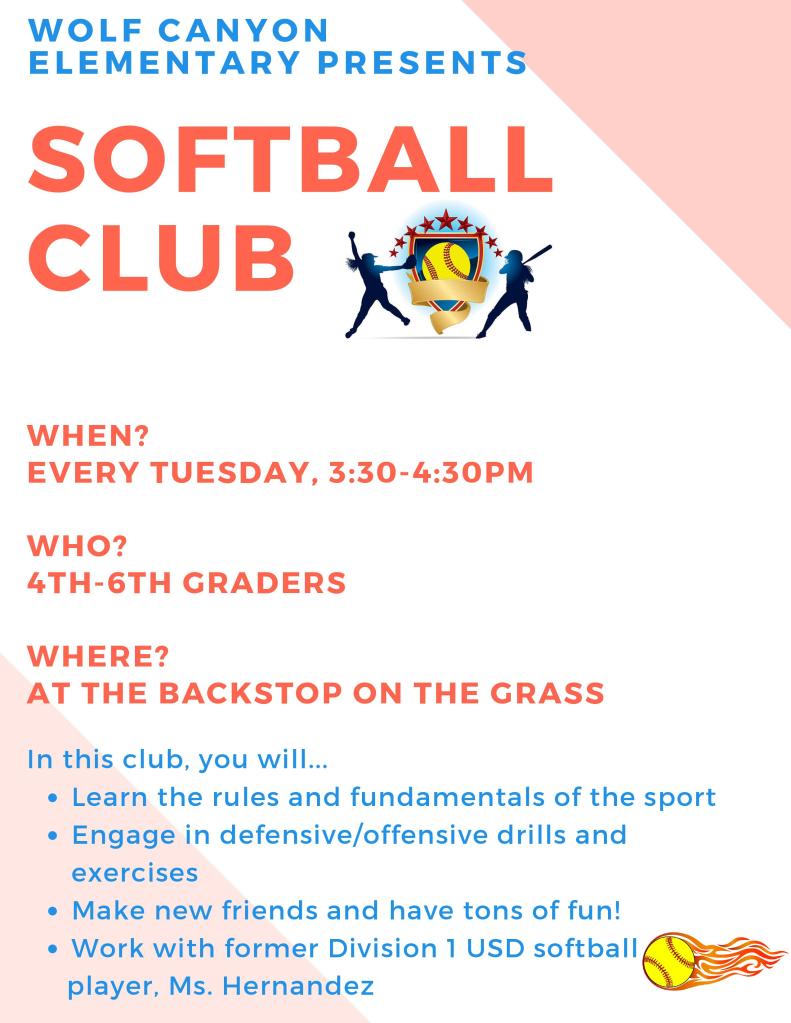 Softball Club starts April 9th! The club is every Tuesday 3:30-4:30 PM. If you have any questions, please email anai.garcia@cvesd.org