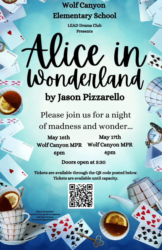 We are thrilled to announce that our talented students at Wolf Canyon, in our LEAD Theater Club, are bringing the magical world of Alice in Wonderland to life on stage! Our students have poured their hearts into this production, and we cannot wait for you to experience their hard work and dedication!