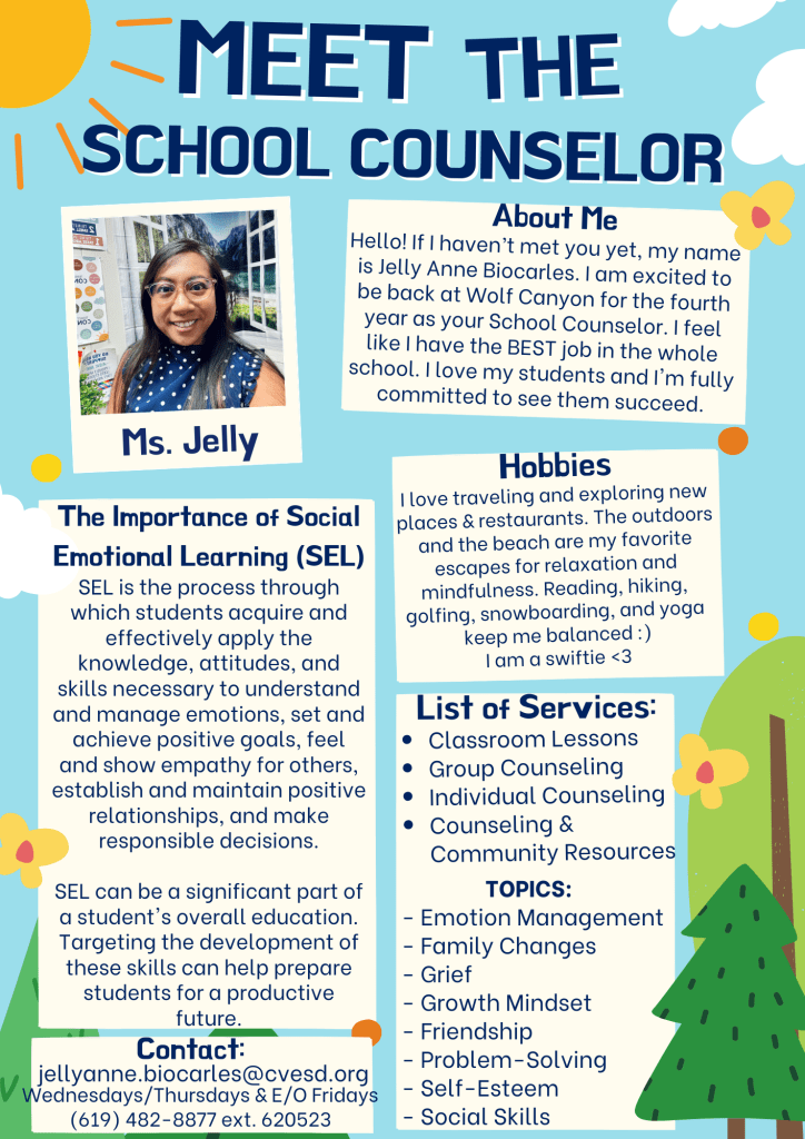School counseling support is provided to all our students. If you would like counseling for your student this 2024-2025 school year, please fill out the form below and sign the consent form (see attached). These forms need to be filled out and signed yearly. You may email the signed form to jellyanne.biocarles@cvesd.org or turn them in the school office. Contact Ms. Jelly if you have any questions or concerns.