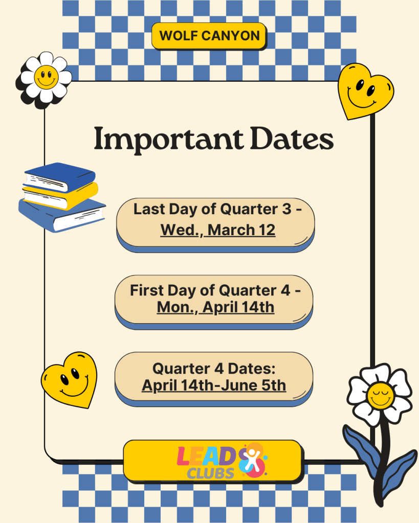First up, all morning and afternoon LEAD clubs will conclude on Wednesday, March 12th. After that, we will be taking a brief break before Quarter 4 begins.