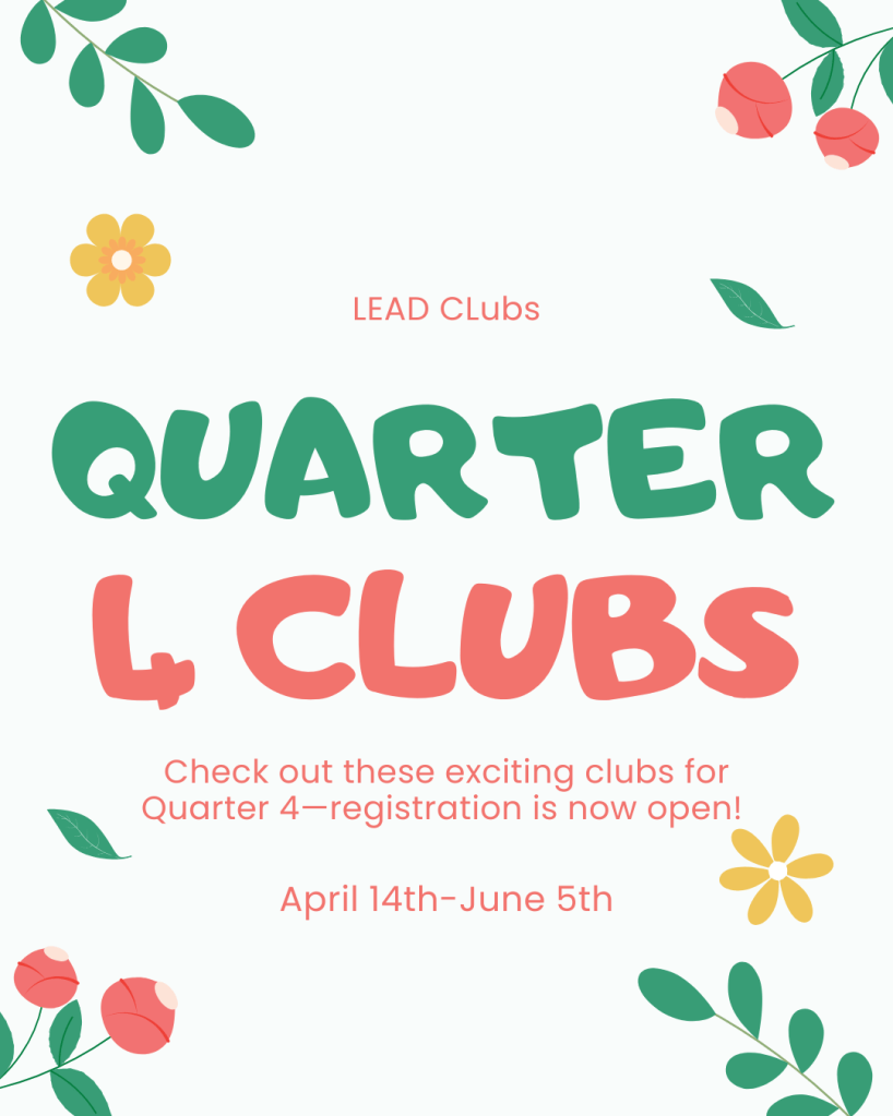 Registration for Q4 Clubs opens today at 6pm. I have attached the link where you can access all of our clubs for Quarter 4. All families will be notified by March 21st at 6pm if your student has been accepted into a LEAD Club.
