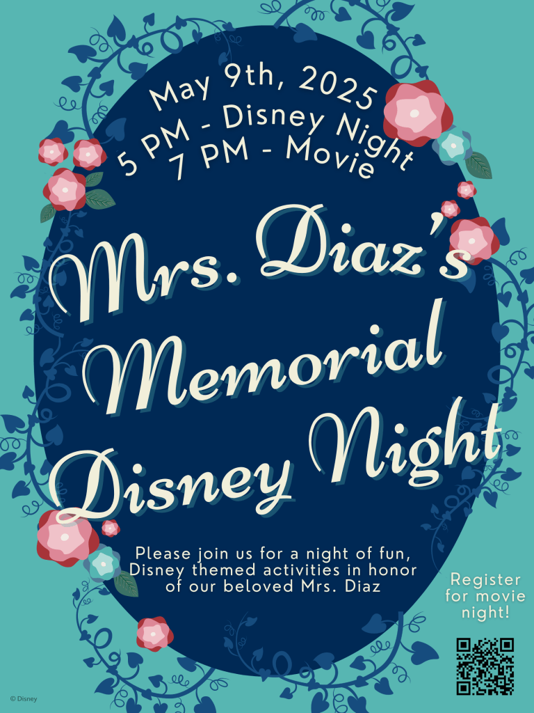 Please join us for “Mrs. Diaz’s Memorial Disney Night” on Friday, May 9th! Come enjoy fun Disney inspired games and activities, and afterwards PTA will host a movie night. Check-in will begin at 4:30, the Disney activities will go from 5:00-7:00, and the movie night will start at 7:00. You can come for just the Disney games, just the movie night, or both! Dinner will be provided during the movie night by PTA with tickets for 1 food, snack, and drink item per person.