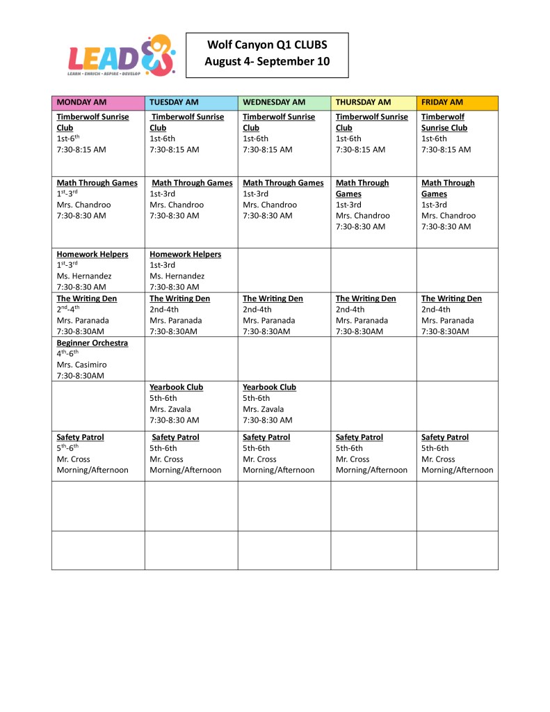 When you register, please note that your student will be placed on a waitlist initially. We’ll notify you by July 25 if your child has been accepted into their club or if they will remain on the waitlist. These notifications will come from leadwolfcanyonelementary@jumbula.com, so please keep an eye on your inbox.
