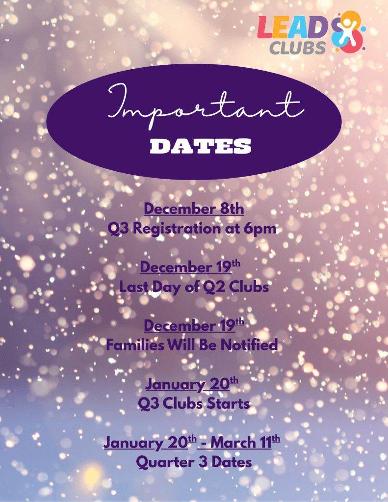 - Last Day of Quarter 2 Clubs: Friday, December 19th