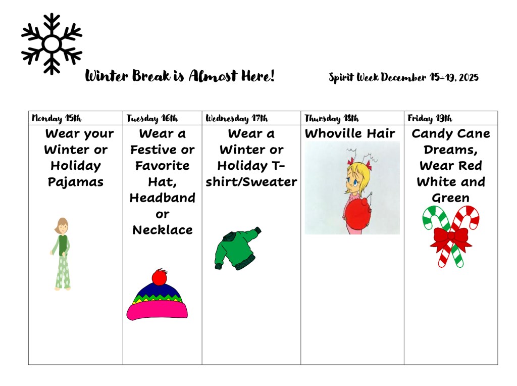 This week, we welcome the holidays with our December Spirit Week. Each day, we can show Timberwolf school spirit with daily themes. Please see this week’s event schedule below and the attached flier for more information!