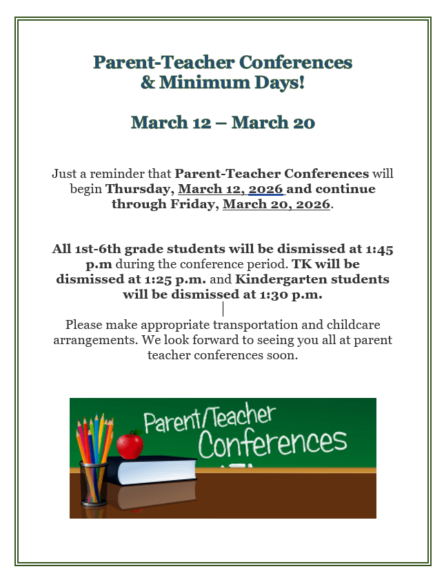 All 1st-6th grade students will be dismissed at 1:45 p.m. during the conference period. Kindergarten students will be dismissed at 1:30 p.m. and Transitional Kindergarten students will dismiss at 1:25 p.m.