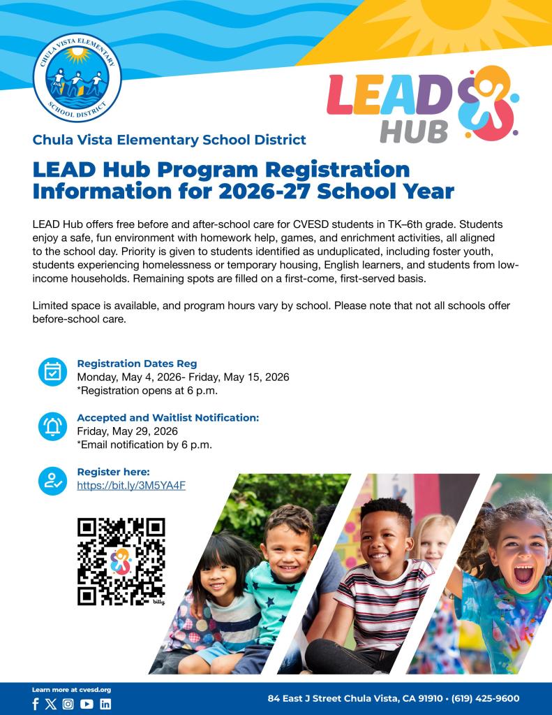CVESD’s LEAD Hub program provides before and after school programs at all district schools. LEAD Hub aims to create a safe, supportive environment where children can learn, grow, and thrive. The program combines recreation, homework assistance, and enrichment activities. LEAD Hub is available at no cost for CVESD students in transitional kindergarten through sixth grade and is aligned with the school calendar. LEAD Hub hours will vary by school site and depend on the school’s start and end times. Please note that not all locations have a before-school program.