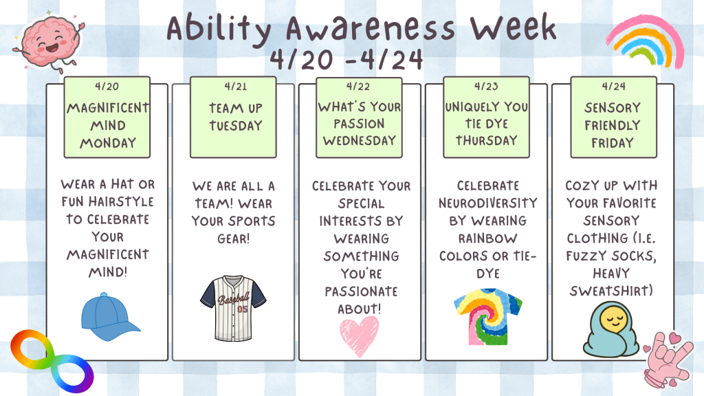 Next week our school is celebrating Abilities Awareness Week ! Please see our spirit days for April 20 – 24. This year our school is doing a drive to create sensory bags for our first responders. These bags are used by first responders in the police and fire departments when responding to calls that involve children with disabilities. If you are able to donate, please check our Amazon wish list below! https://www.amazon.com/hz/wishlist/ls/3BHL4T1ZXKH0C?ref_=wl_share