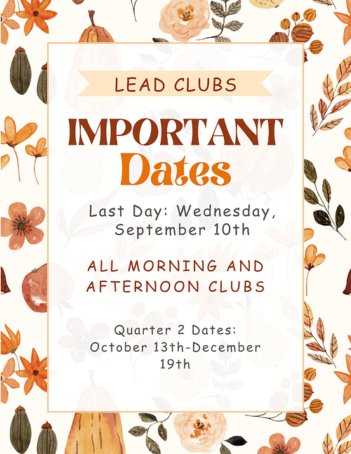 Reminder: The last day for all morning and afternoon clubs will be Wednesday, September 10. Please note there will be no LEAD Clubs during parent conferences.